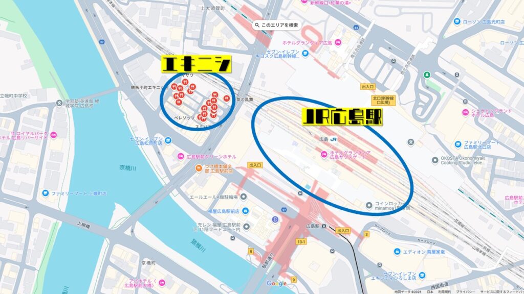 広島駅の西隣りに位置する飲食街。その歴史は古く1950年代後半から飲食店が立ち並んでいたらしいが、所謂ガラの悪い地域として認識されており、現在の様なスポットになった(生まれ変わった?再デビュー?)のは2010年を越えてからだと思う。そこそこの数の観光客が訪れる広島の、しかも駅のお隣でありながらこの地域の発展が遅れたのは、ひとえに駅周辺の再開発の遅れと、広島市の歪な地理にある。それは広島のメイン歓楽街が広島駅から離れているということ。これからは少し変わってくるかもしれないが、基本的に広島人は駅近辺で遊ばない。実際週3~5近く飲んでいた私も、エキニシで飲んだのは両手で足りる程度である。(今年に入り12年振りに行った。岩村さん推薦:デニーロ)
