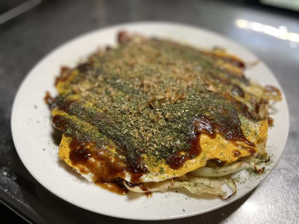 かずもと氏:古い。ワシらがガキの頃の食べた、おばちゃんが焼く近所のお好み焼き屋って感じじゃの。広島じゃぁオーソドックススタイルなお好み焼きでも、やっぱり焼き方も含めて進化してて、それがこっちは昔のまんま。