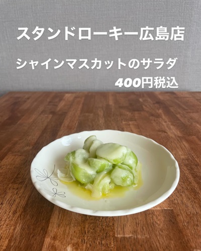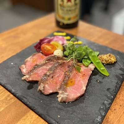 面白一品料理が概ね400円で頂ける。「八朔のマリネ」、「あまおう苺のサラダ」、「干しいちぢくとジャムとオイルとカマンベールチーズ」、「シャインマスカットのサラダ」など女性から支持を得そうなメニューもあれば、人気1位の「ローストビーフ切り落とし」、「海老とザーサイの四川麻辣和え」、「桜島鶏もも肉の韓国ユッケ仕上げ」など、お酒のお供として間違えなさそうなメニューもある。